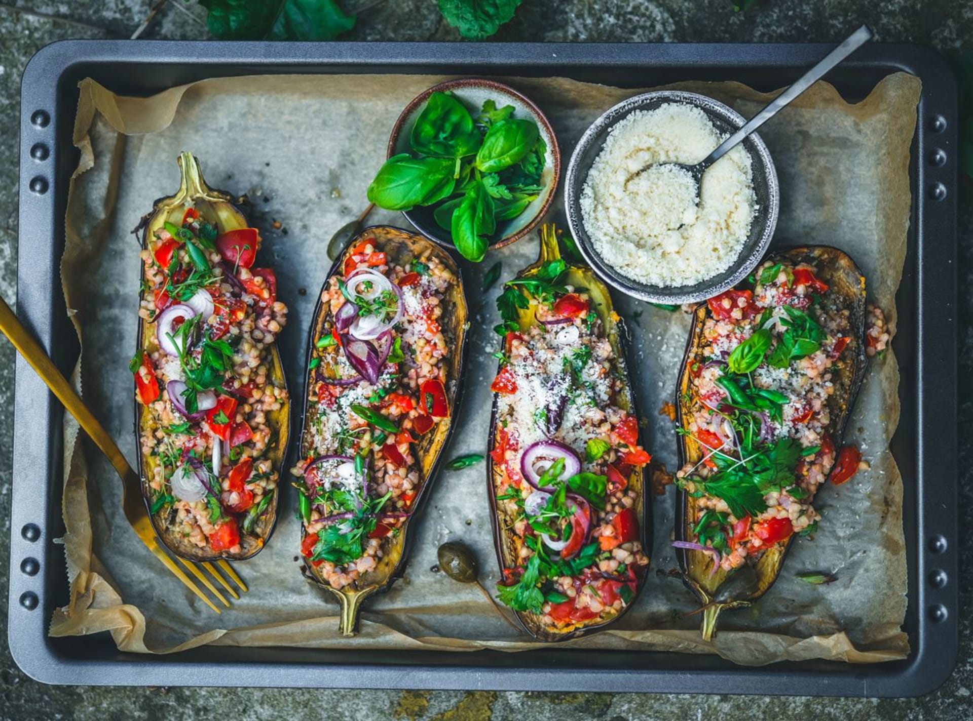 Bez masa: Pečené lilky s pohankou, rajčaty a parmezánem podle Kardamommy
