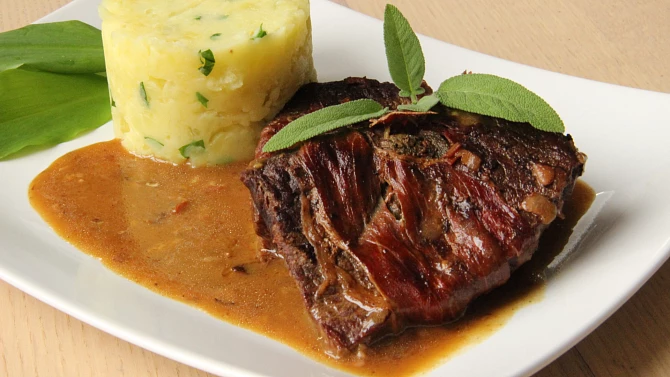 Suroviny 4 roštěná jelení ( může se klidně použít i hovězí) 10 listů šalvěje 4 plátky sušeného pršutu nebo jiné sušené šunky 150 ml bílého vína 100 ml vývaru 2 stroužky česneku kousek másla 1 polévková lžíce hladké mouky sůl pepř olej Postup přípravy