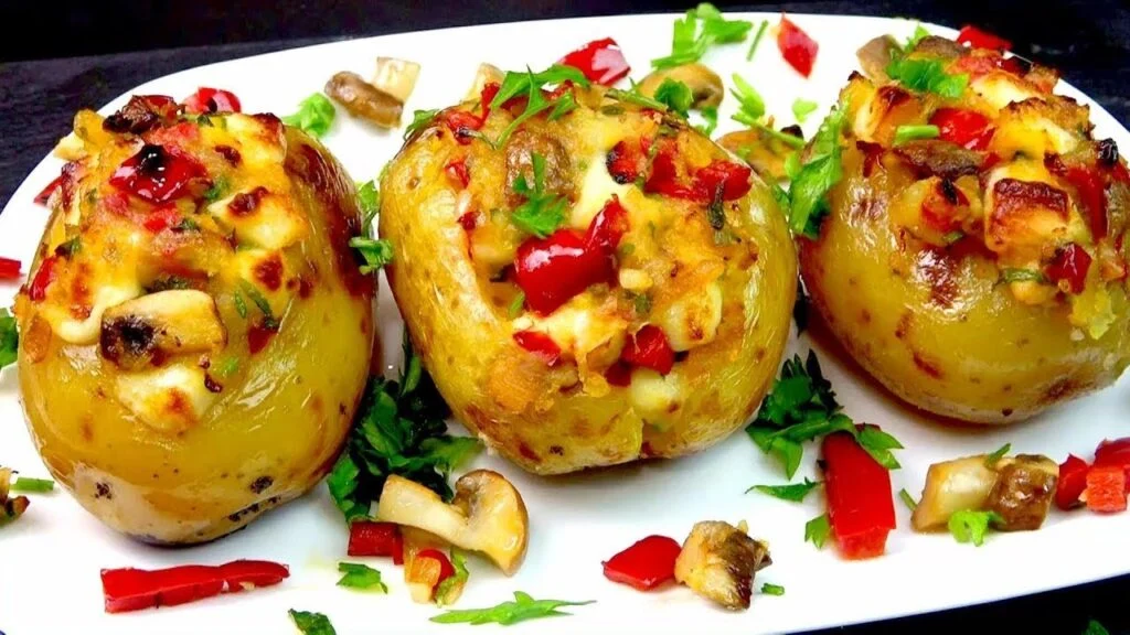 Co budeme potřebovat: Základ: 4 velké brambory (nejlépe nové brambory ve slupce) 2 lžíce olivového oleje Špetka soli Náplň: 1 cibule 1 červená sladká paprika 1 červená chilli paprička (volitelné) 160 g žampionů 75 g uzeného sýra Čerstvá petrželka (podle chuti) Olivový olej na smažení Jak budeme postupovat: