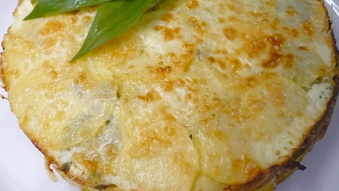 Brambory zapečené s medvědím česnekem, sýrem a smetanou v remosce