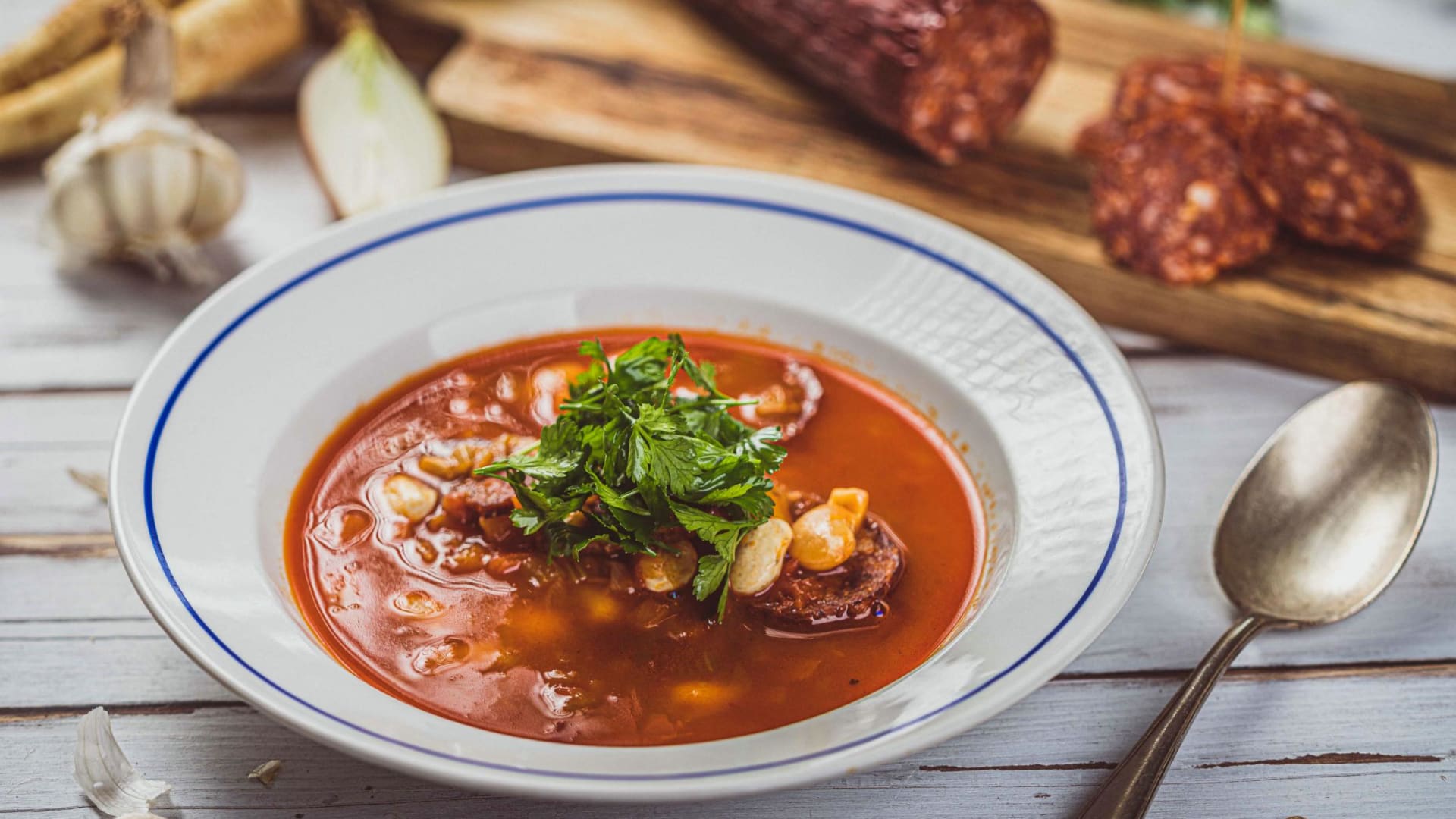 Fazolová polévka s pikantní klobásou a uzenou paprikou