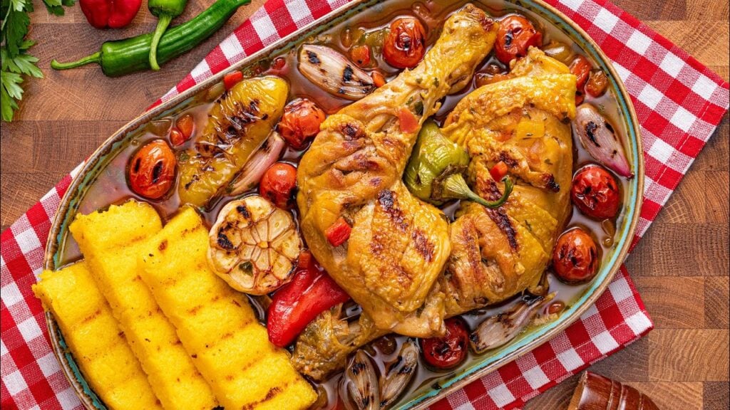 Grilovaná kuřecí stehna s pečenou zeleninou a bylinkovou omáčkou