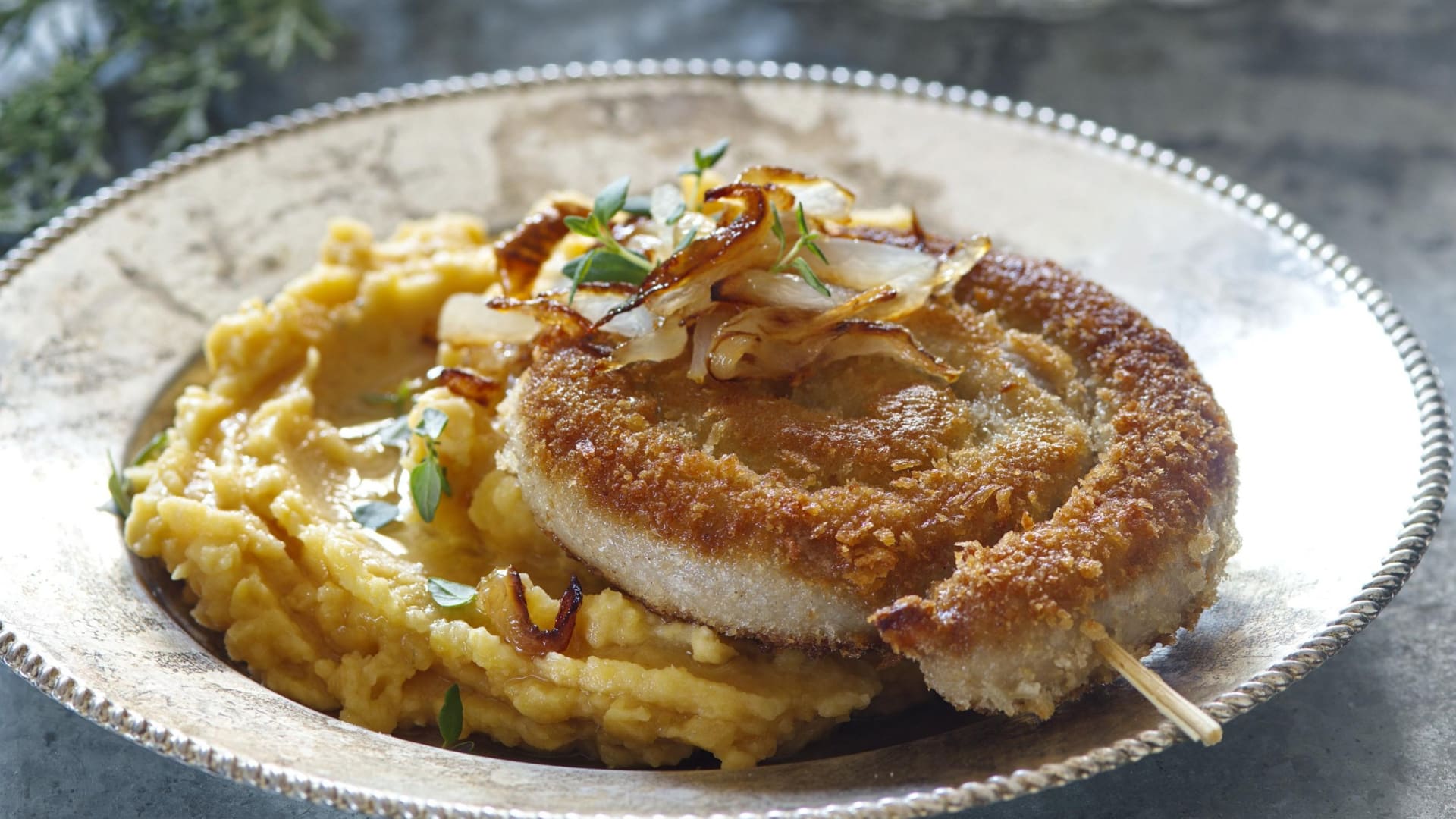 Smažená vinná klobása s hrachovou kaší