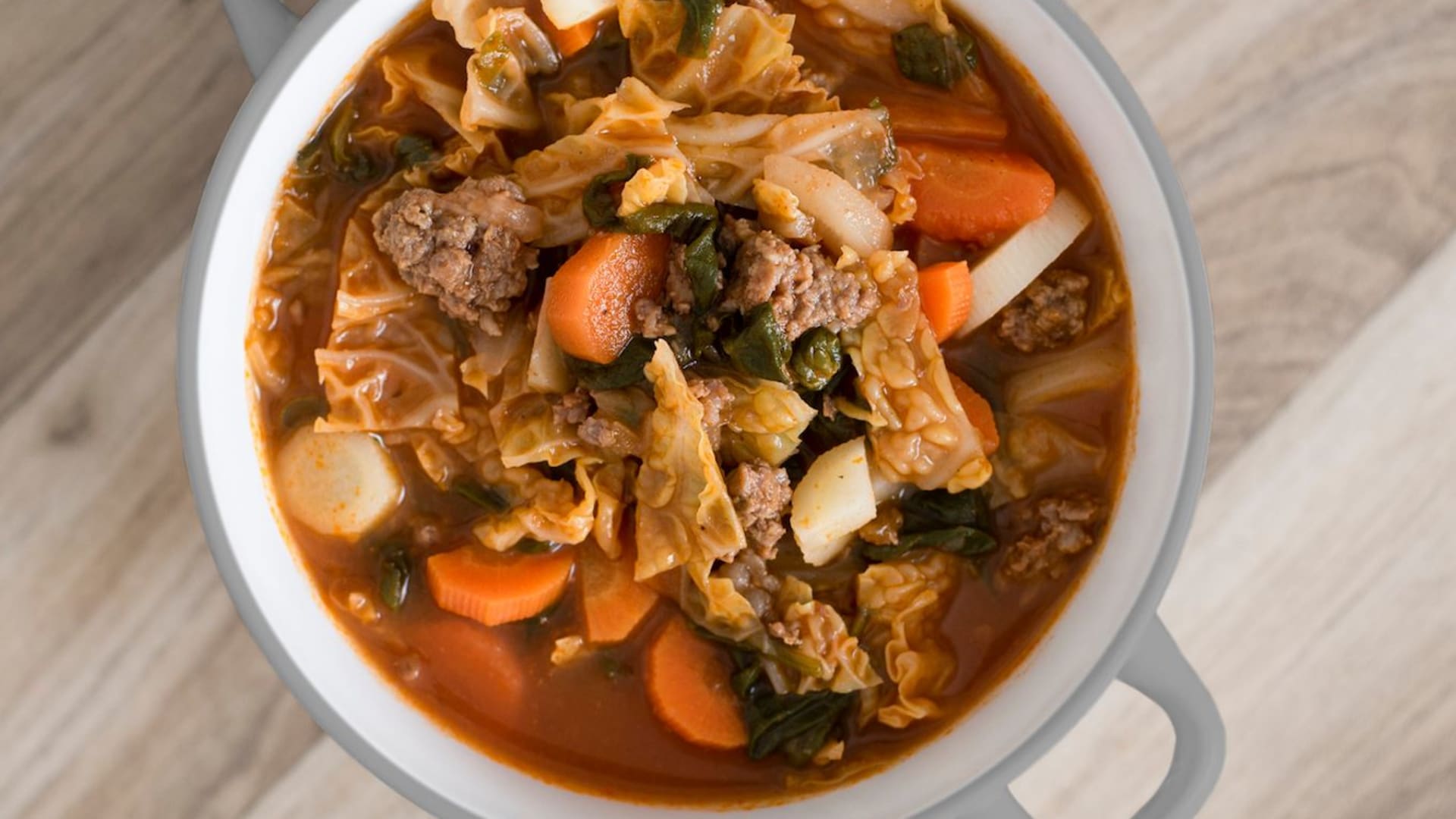 Sytá polévka s mletým hovězím masem, kapustou a kořenovou zeleninou