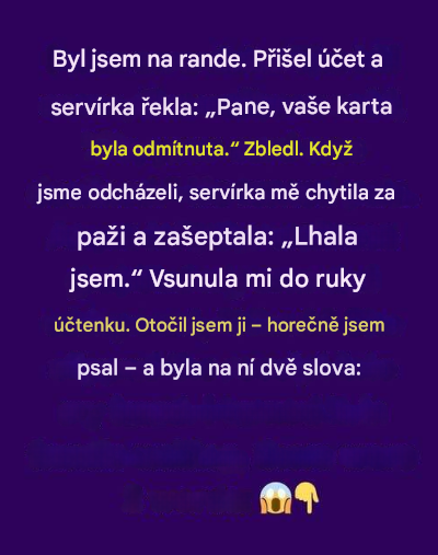 Byl jsem na rande. Přišel účet, servírka se podívala na mého rande a řekla: „Prosím vás, vaše karta byla odmítnuta”.