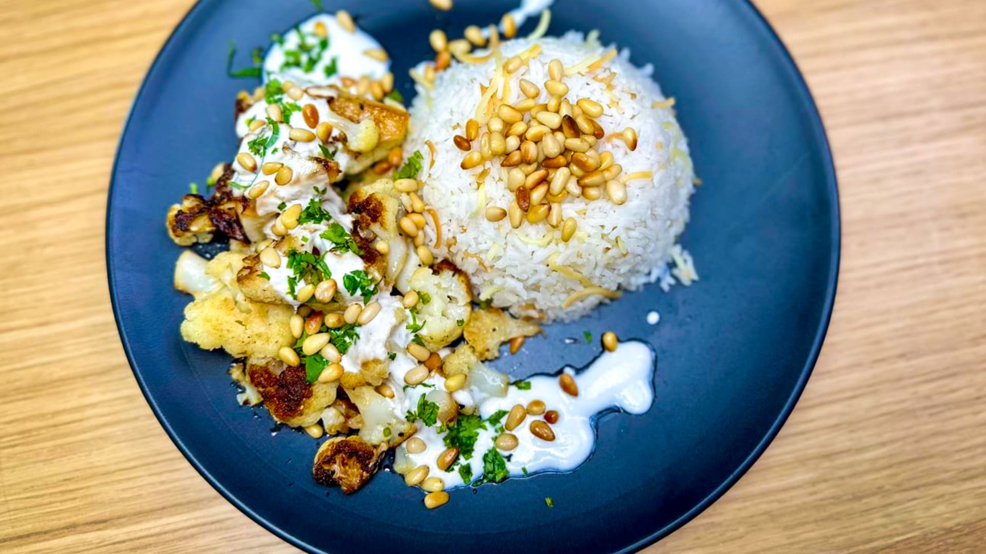 VE VARU: Smažený květák s domácí tahini omáčkou a basmati rýží s restovanými nudlemi