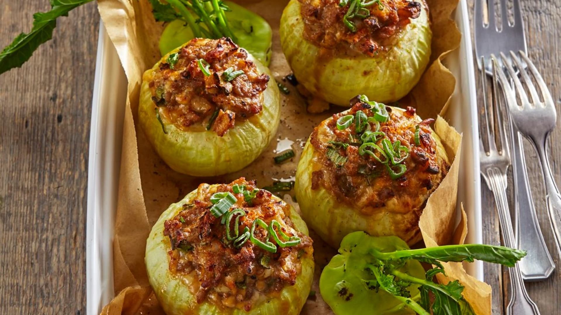 Kedlubna patří mezi druhy zeleniny, které obvykle tepelně neupravujeme. Je prostě výborná za syrova, křehká, šťavnatá, a proto se hodí do salátů nebo je ideální nakrájená na hranolky k nabírání různých pomazánek nebo třeba hummusu. Z přerostlých kousků se pak dělá kedlubnové zelí, ale tím repertoár většiny z nás končí. Kedlubna však umí překvapit, dejte jí šanci v nové podobě. Upečte ji naplněnou masovou směsí. Promění se v opravdovou lahůdku a stane se hlavní hvězdou na talíři.