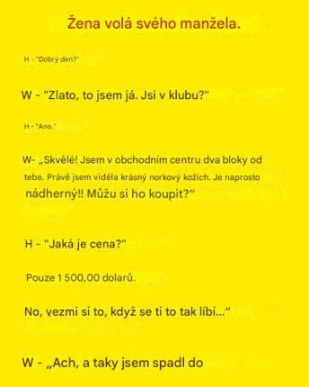 W – „Skvěle! Jsem v obchodním centru dva bloky od tebe. Zrovna jsem viděla nádherný kožešinový plášť. Je absolutně úžasný!! Můžu si ho koupit?”